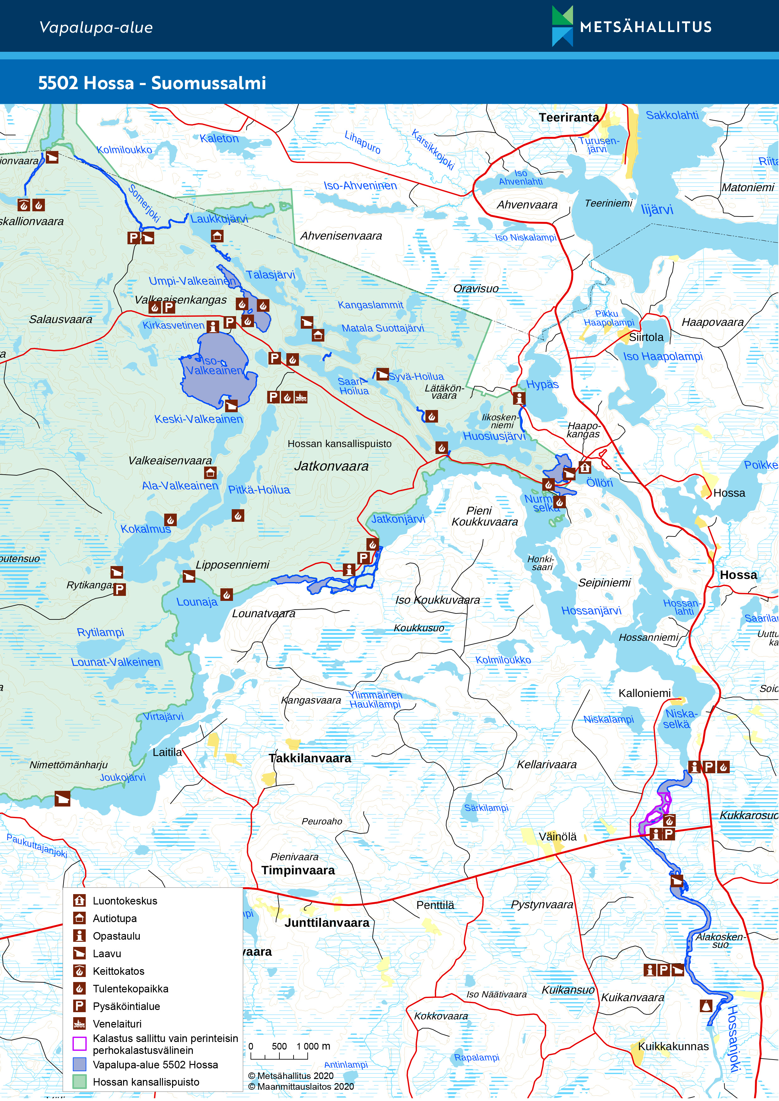 Metsähallituksen vapalupa-alueeseen Hossa 5502 kuuluneet Ala-Valkeainen, Keski-Valkeainen, Pitkä-Hoilua-Kokalmus ja Kirkasvetinen siirtyvät 1.1.2021 alkaen yleiskalastusoikeuksien piiriin, eikä niissä kalastamiseen enää vaadita vapalupaa.